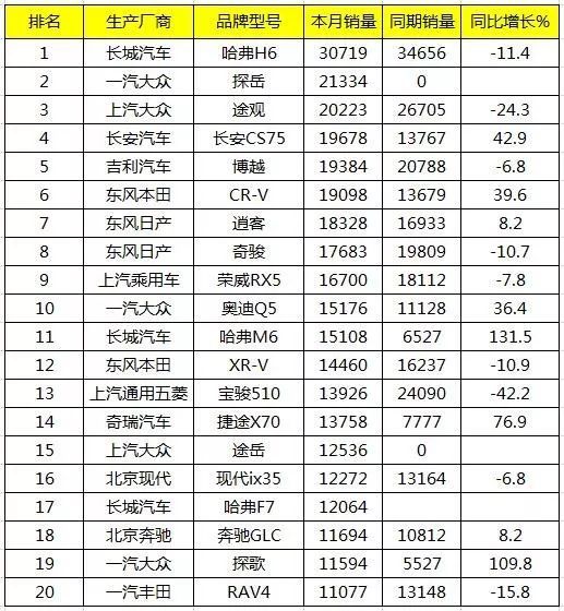 9月,哈弗H6仍然是国内SUV市场月度销量冠军车型。哈弗H6本月销量突破3万辆,销售30719辆。同时,哈弗M6销售15108辆,同比增长131.5%;哈弗F7销售12064辆,居SUV月度销量前20强第17位。从销量来看,哈弗H6领先SUV销量第2名超过9000辆。长城汽车也实现了3款SUV车型同时进入SUV月度销量前20的强势回归。