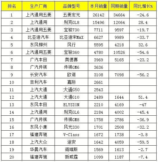 9月,国内MPV市场仅有五菱宏光、别克GL8两款车型突破1万辆。五菱宏光销售26142辆,同比下跌24.6%;别克GL8销售15496辆,同比增长28.4%。(健坤)