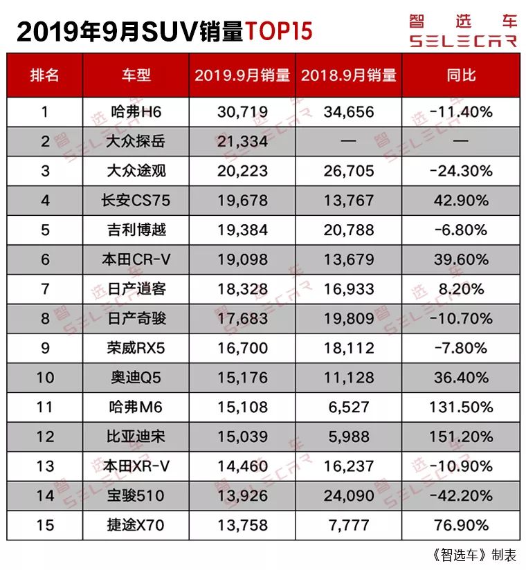 1.哈弗H6以30719辆的成绩斩获9月份SUV销冠,大众探岳 (配置|询价)与大众途观 (配置|询价)位列第二、三名。探岳表现喜人,途观则存在同比24.3%的跌幅。可以发现,途观近几个月来的下滑趋势也较为明显。