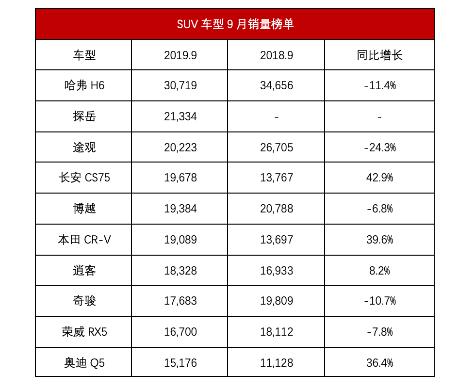 清晰的记得,在8月SUV销量榜单中,排名第一的哈弗H6售出了23,000辆,仅比排名第二名的本田CR-V (配置|询价)(20,431)多售出了不到3000辆。而从本月成绩来看,哈弗H6拉开了与第二名探岳 (配置|询价)的差距,实力证明自己仍然是SUV市场无可争议的“大哥”。而对于本田CR-V、逍客、奇骏来说,9月销量其实并没有下降太多,只是因为几款竞品的增量大导致的排名靠后。