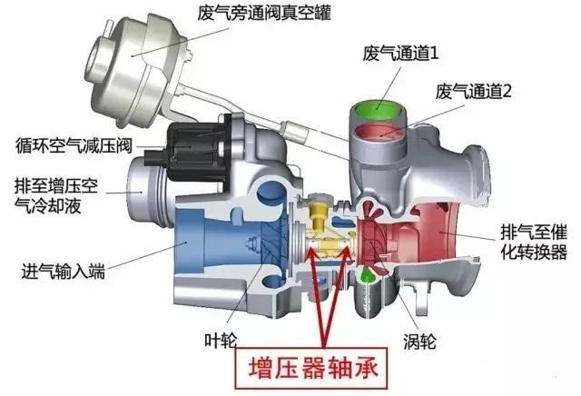 车用涡轮增压器由离心式压气机、径流式涡轮机及中间体三部分组成,涡轮的进气口与发动机排气歧管相连,排气口与排气管相连;压缩机的进气口与进气管相连,排气口则接在进气歧管上。涡轮机和压缩机通过一根轴刚性的连接在一起同步转动,俗称增压器转子,是涡轮增压器最核心的部件,通过两个浮动轴承支承在中间体内。增压器在工作时转子以每分钟8万~20万的转速高速旋转,采用全浮式滑动轴承,工作温度高达900到1000℃,因此需要高强度的润滑和冷却。所以在中间体内有润滑和冷却轴承的油道,来自发动机润滑系统主油道的机油,经增压器中间体上的机油进口进入增压器,润滑和冷却增压器轴和轴承。然后,机油经中间体上的机油出口返回发动机油底壳,将增压器的热量带走。如果这些轴承得不到良好的润滑和散热,会引起轴承的异常磨损,叶轮轴径向间隙增大,跳动量增大,从而导致漏油的发生或引起异响,大大缩短增压器的使用寿命。