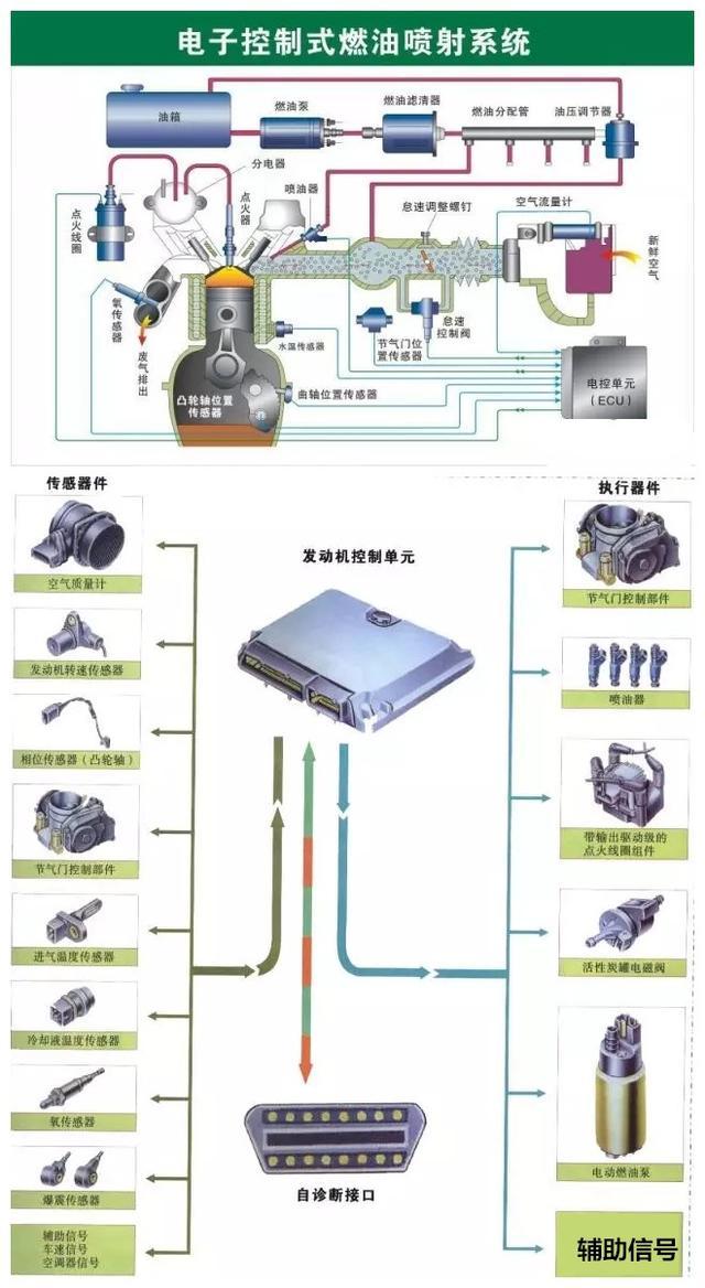 现在的汽车发动机普遍采用电控燃油喷射系统,它的基本工作原理是:各种传感器将检测到的发动机进气量、转速、曲轴转角、节气开度、发动机温度、车速等信号输入发动机控制单元ECU,ECU对信号进行处理、运算、比较、分析和判断后,向各种执行部件发出控制命令,使发动机喷油、点火系统等在最佳的或设定的范围内工作。也就是说,发动机并不是只要运转就会喷油,而是根据传感器的信号来判断汽车的运行状态和驾驶员的驾驶意图,并据此发出控制指令,使发动机既能正常运行,又能最大限度的减少燃油的消耗。