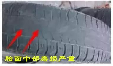 导致这种现象的主要原因是:轮胎气压长期偏高、轮胎胎面过宽、轮辋过窄,轮胎的磨损主要由胎面中部承担。