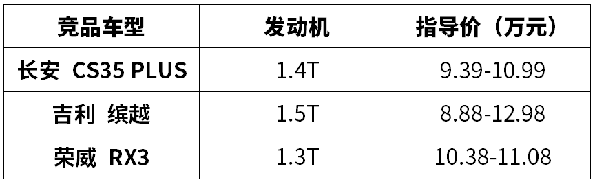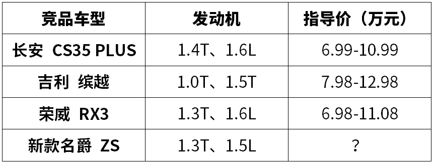 长安CS35 PLUS和荣威RX3的入门版价格分别为6.99和6.98万元,而且入门版车型均为1.6L自然吸气版本,而吉利缤越由于全部为涡轮增压车型,所以起步价接近8万元。而名爵的1.5L车型入门价格必然会比缤越入门价更低,而接近长安CS35 PLUS和荣威RX3的入门价。