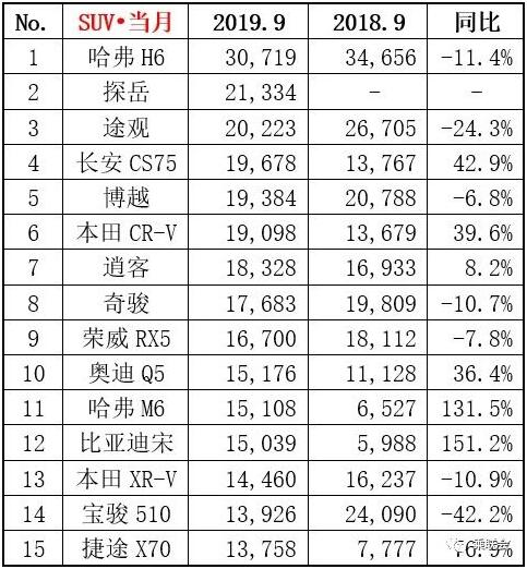 因为乘联会给出了前十五名的SUV销量,所以我们还能接着往下看,这个时候比亚迪宋出现在视线里,让人有些不敢相信。虽说比亚迪换了设计师后销量暴涨,但是能够出现在前十几名单中还是有些夸张,在9月它售出了15039辆,同比增长151.2%,堪称9月最大黑马。异军突起的比亚迪背后是它多年的艰辛付出,混动与燃油以及纯电三个版本共同努力,再凭借高品质,最终得到市场认可,希望可以保持下去。而奇瑞子品牌捷途也再次登榜,旗下入门SUV——X70在9月售出13758辆,同样大增,但奇瑞没火子品牌火了,似乎成为一个魔咒。