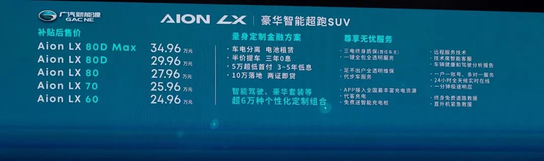 近年来,广汽新能源的产品一直让人期待,此前Aion S (配置|询价)的推出让人们眼前一亮,预售45天订单量就超过23000张,持续低迷的汽车市场反而给了高品质豪华车逆势增长的空间。为了进一步巩固在新能源市场建立的优势地位,广汽新能源乘胜追击,10月17日在上海中国船舶馆正式推出了广汽新能源Aion LX (配置|询价),新车共推出5款车型,补贴后售价区间为24.86-34.96万元。其中Aion LX 80DMAX售价为34.96万元,此款车型为80D的顶配车型。