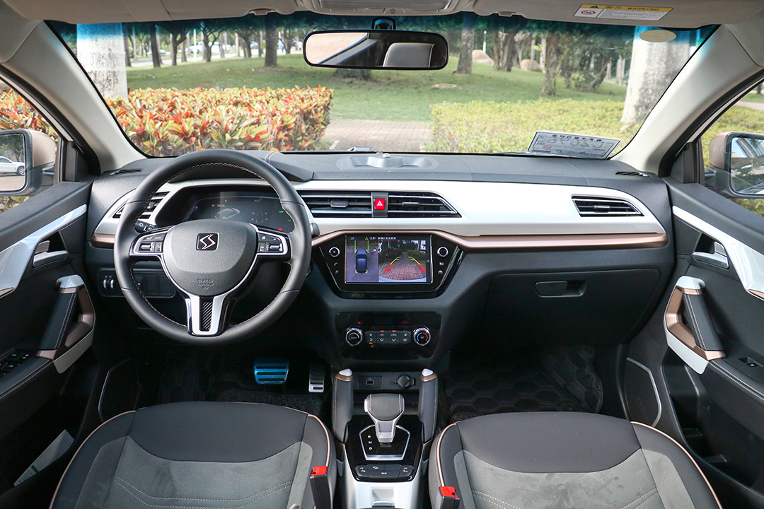 打开车门,映入眼帘的是泾渭分明的内饰布局,黑白双拼撞色调,辅以黄铜色加以点缀装饰,既少了些“土味”,也多了些精致感。