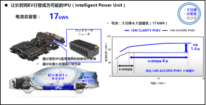 在电池方面,SPORT HYBRID e+的IPU(智能动力单元)采用17kWh锂离子电池。据了解,搭载这套系统的Clarity PHEV车型在日本JC08工况下的纯电动续航里程达到110公里以上,电动+发动机的综合续航里程达到800公里以上。
