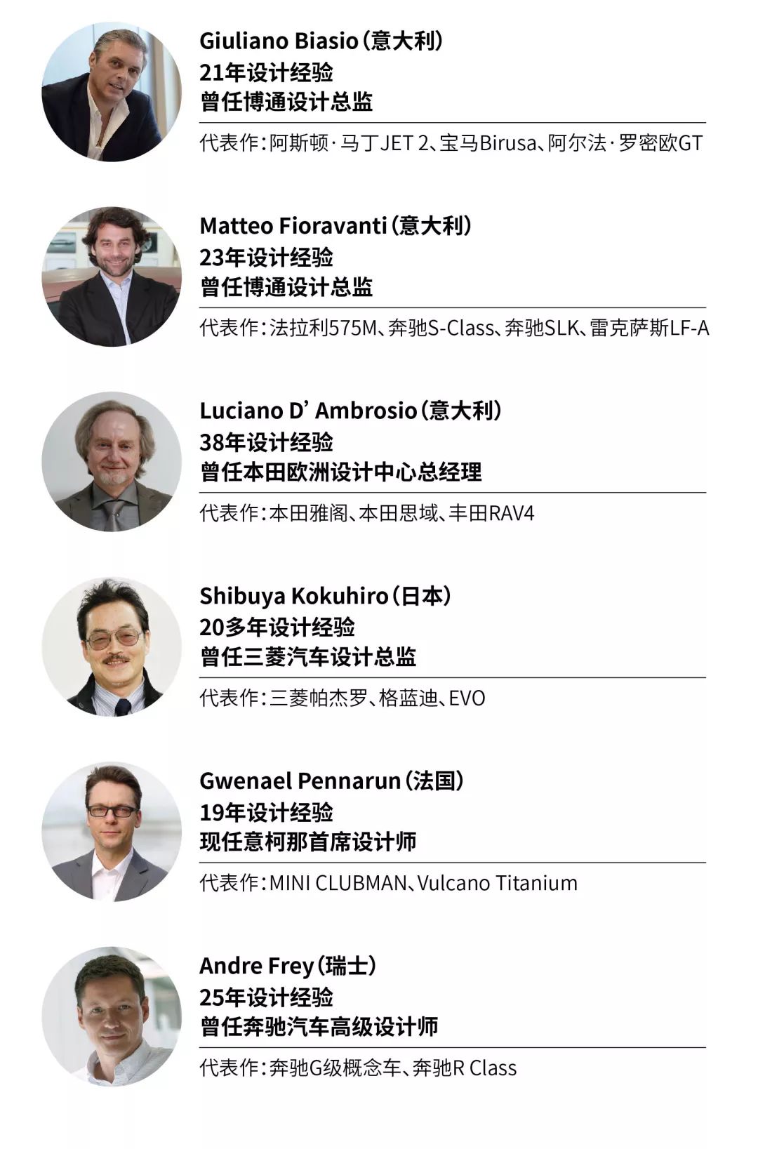 此次签约的15人设计大师完成了新品开发需求全覆盖,他们当中有负责本田雅阁、思域,丰田RAV4亲民车型开发,同时也有奔驰E级 (配置|询价)、C级,宝马X3、X6等豪华品牌设计,还有奔驰G级、三菱帕杰罗等经典传承车型。