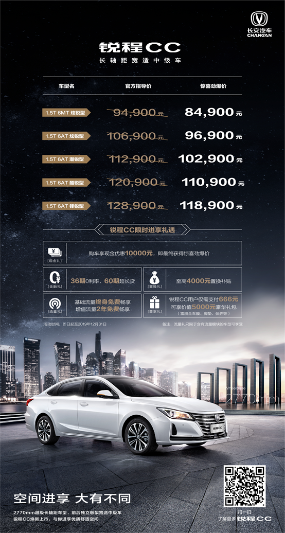 10月17日,我们从官方渠道获悉,长安旗下全新中型轿车锐程CC于今日正式上市,本次共推出5款车型,售价区间为9.49万-12.89万元,12月31日前购车可享受10000元现金优惠,优惠后售价区间为8.49万-11.89万元。据了解,新车采用了全新的家族式设计语言,新车在睿骋CC车型的基础上,对外观细节上做了多处调整,并对配置进行了升级。