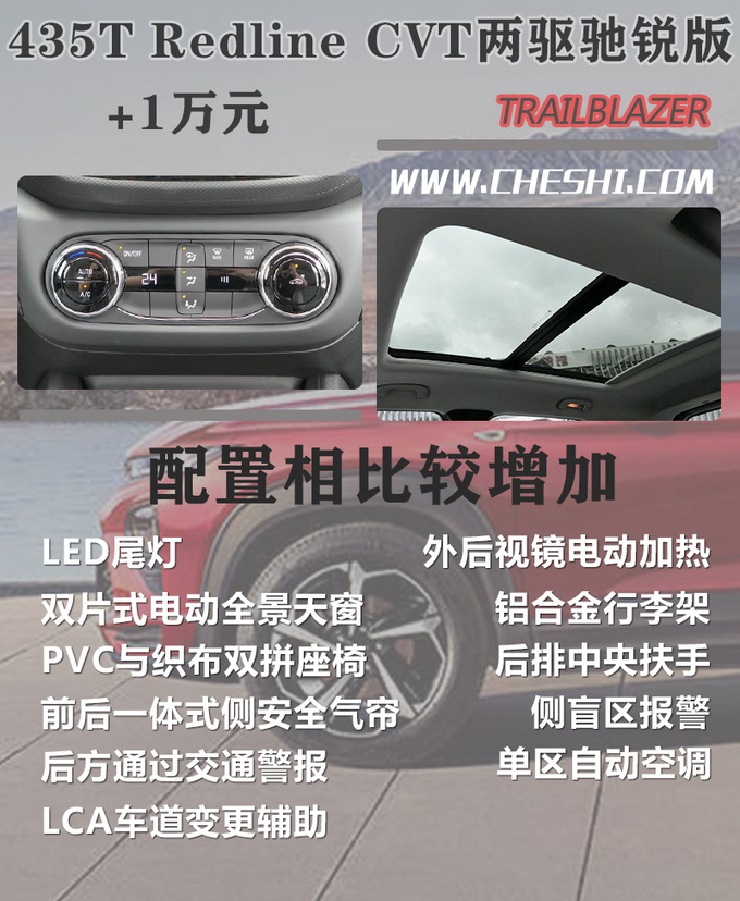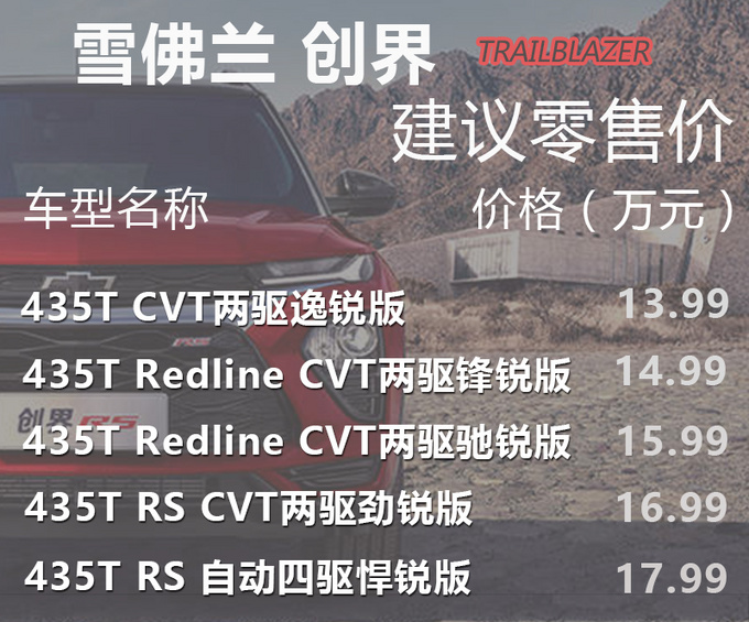 在分析具体车型配置之前,我们先来简单介绍一下创界的一些基础信息,雪佛兰创界全系提供火山红、冰原白、海崖灰、极夜黑4种车漆,而最低配车型的深海蓝、熔岩棕、星月蓝3种颜色并没有出现在官网上,同时RS版以及Redline版车型在外观以及内饰的装饰上有所不同。创界全系共提供5款配置车型,每一款车型售价均比上一款贵出1万元。