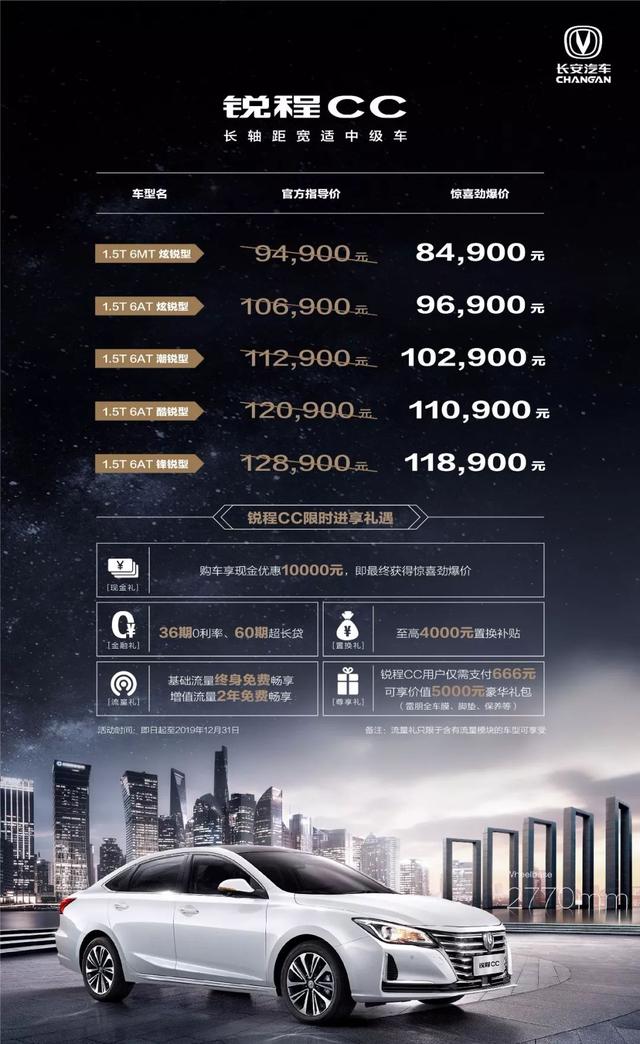近日,长安锐程CC正式上市,新车共推出5款车型,售价区间位于9.49-12.89万之间,同时今年12月31日前购车还可享受1万元现金让利,让利后价格仅为8.49-11.89万之间。当然,除了这些之外,还有包括金融礼、置换礼等在内的多重大礼供消费者选择。
