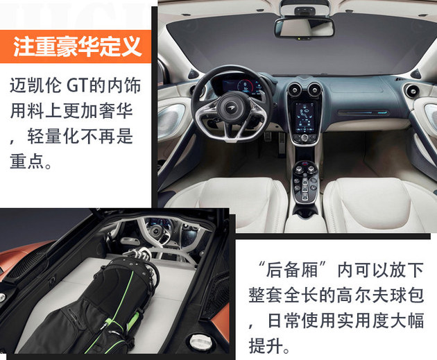 虽然该迈凯伦GT拥有Sport与Super车系之外最长的车身长度,但其整备质量仅为1530公斤,官方称这一数据相比定位最接近的对手轻130公斤。迈凯伦为该车定制的MonoCell II-T(T代表Touring)碳纤维单体壳式车身延展至发动机上方,为新车创造出更多行李厢空间。
