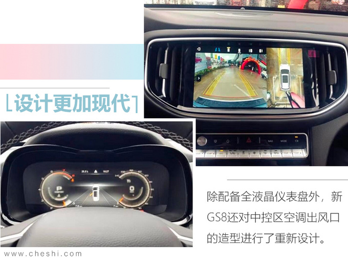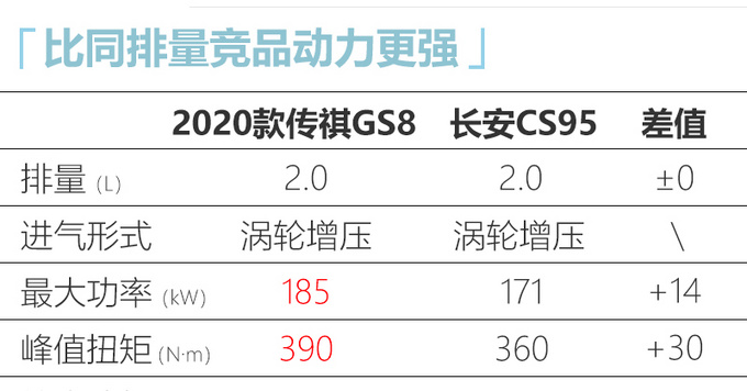 2020款传祺GS8搭载传祺第三代390T发动机,额定功率185kW,最大扭矩390N·m,动力输出超过了长安和哈弗品牌的同排量机型。这款发动机是国内率先搭载350bar高压直喷技术的2.0T GDI发动机,在提升动力效能的同时,将新车的百公里综合油耗降低至7.9L,满足国六B排放要求。传动系统则沿用了2017款车型上的爱信6AT第三代手自一体变速箱。