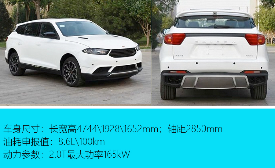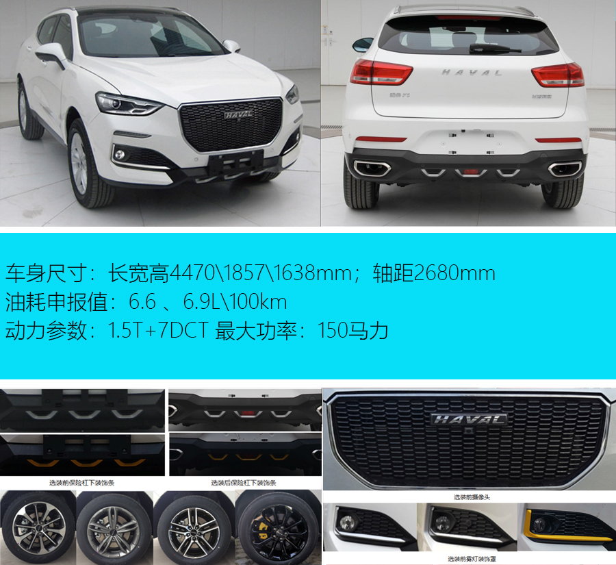 新车长宽高分别为4470/1857/1638mm,轴距为2680mm。根据配置的不同,新车可选装前摄像头、雾灯镀铬条、前后保险杠下方装饰条和不同风格的轮毂等配置。动力方面,本次申报的新车搭载了一台代号为GW4G15F的1.5T发动机,最大功率为150马力, 相比在售的哈弗F5车型的最大功率低了19马力。