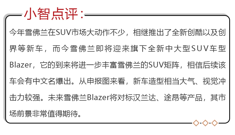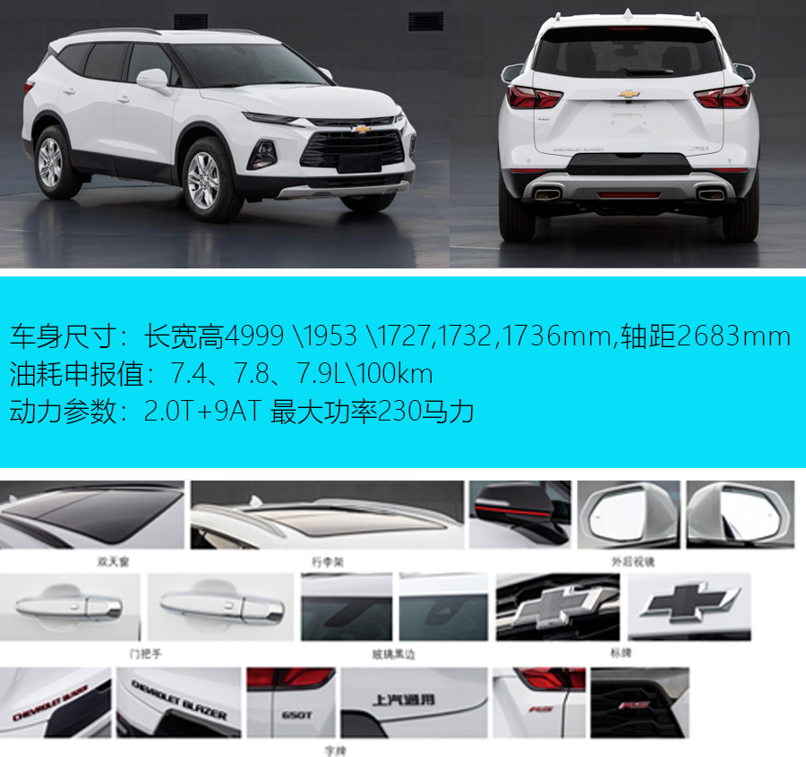 近日,工信部发布了上汽通用雪佛兰Blazer 的申报信息。新车定位中大型SUV,提供5座/7座两种座椅布局。据悉,雪佛兰Blazer将在年内正式亮相。造型上,国产雪佛兰Blazer基本延续了海外版本的设计,前脸采用了分体式灯组设计以及大尺寸网状格栅,搭配细长的LED日间行车灯,其造型相当大气;车尾新车采用了雪佛兰家族化的双Y型的尾灯。新车长宽高分别为4999/1953/1727、1732、1736mm,相比海外版本有了一定的提升,轴距则和海外版本保持一致,为2863mm。新车根据不同车型提供三种规格轮胎,分别为235/65 R18、235/55 R20、265/45 R21。