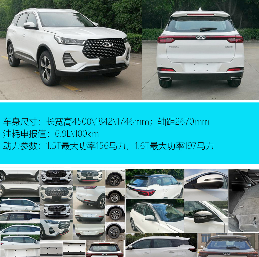 近日,工信部公布了新款瑞虎7 (配置|询价)的申报信息。新车外形相比现款车型有较大的变化,其整体造型风格则和瑞虎8较为相似。新车中网采用了点阵式的设计,车头两侧的前大灯变得更加狭长。新车还采用了当下流行的悬浮式车顶,车尾尾灯采用了贯穿式设计,排气尾喉的造型变为长方形。尺寸方面,新车长宽高为4500/1842/1746mm,轴距为2670mm。与现款车型相比,新车的长宽高均有所增长,轴距保持不变。