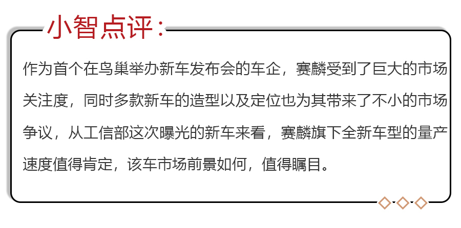 动力方面,新车搭载一台来自长城汽车的最大功率224马力的2.0T发动机。从工信部公布的动力来看,赛麟发布会上提及的406马力、450牛·米动力的版本车型并为出现。