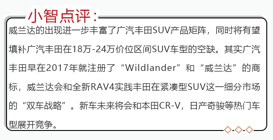 据悉,广汽丰田旗下的全新紧凑型SUV车型威兰达将在11月的广州车展上发布,预计明年一季度上市。新车前脸造型非常犀利,前格栅采用蜂窝网状的设计,修长的大灯组较为锐利;尾灯辨别度很高,并且尾部还配有双边双出的排气。尺寸方面,威兰达的长宽高分别为4665/1855/1680mm,轴距为2690mm,比全新RAV4荣放的车长略长一点,但轴距相同。