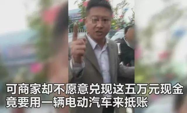 商家表示,50000元奖金会用等值的电动汽车抵账,想要现金?痴心妄想!听到商家这样的回复,中奖的顾客自然不乐意了,于是顾客就指着商家挂出的活动横幅说“我问问你,这上面写的是不是50000元现金?”