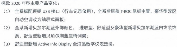 日前网上车市获取了一组一汽-大众新款探歌 (配置|询价)(2020款)的配置图,新车已经陆续到店,可接受预定。相比在售2019款车型,新车在配置方面进行了升级,舒适版车型引入全液晶仪表(需选装)、豪华版车型空调控制区域改为触屏式,另外全系车型的“T-ROC”尾标由右下方改为中置式,而此前只有R-Line版本采用这种尾标设计。价格方面,新款探歌与老款车型价格保持一致,不过舒适型车型选装全液晶仪表需2千元。
