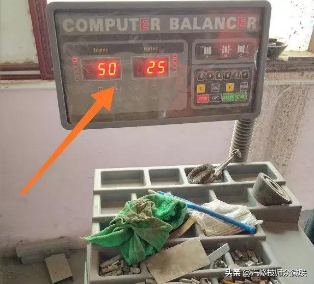 下图箭头所示,这就是汽修师傅测量的新轮胎的动平衡数据!我们可以看出这个数据特别大,说明轮胎重量分配不均匀,这肯定就会导致轮胎高速抖动!汽修师傅需要把数据调整到0和0才行!