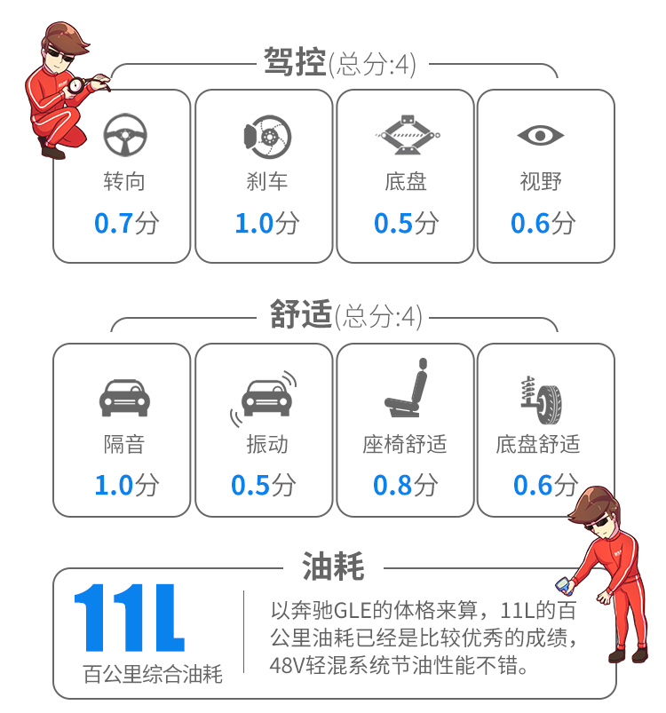 总结:这一代的奔驰GLE依然保留着越野的基因在内,同时车辆的舒适性、内饰的豪华感和外观的精致感都有所提升,完成了奔驰GLE兼顾公路性能和越野性能的初衷。不过,奔驰GLE船一样的悬挂让车身晃动较大,容易引起晕车;同时,其内饰面板掉色,以及故障率较高的空气悬挂,让我们对其质量有较大忧虑,消费者一定要有这方面的心理预期。