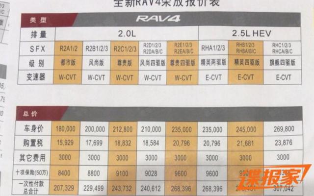 关于RAV4荣放 (配置|询价)麋鹿测试的争议刚过去没多久,近日又有媒体曝光了新车的售价(疑似),从谍照信息中看,全新RAV4将会推出8款车型,其中2.0L版本5款,2.5L 双擎版本3款。疑似售价区间为18.00-26.98万元,不少朋友面对这个售价都认为丰田有点飘了。