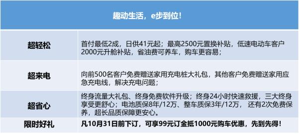 作为国内新能源领域的先行者,东风启辰在电动汽车的研发、制造、销售和服务上拥有完备体系力和领先技术力,充分满足了消费者对高品质出行的需求。为让更多消费者畅享启辰e30的品质魅力,东风启辰特别推出了超轻松、超来电、超省心的三重购车大礼,覆盖购车、用车、保养等全方位的需求,让用车生活e步到位。