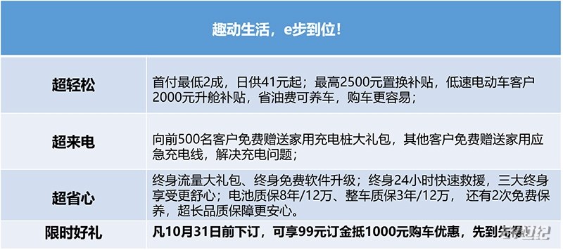 10月31日前下订购车的用户,可享99元订金抵1000元购车优惠。此外还有低首付、置换补贴、低速车升舱补贴等综合优惠活动。