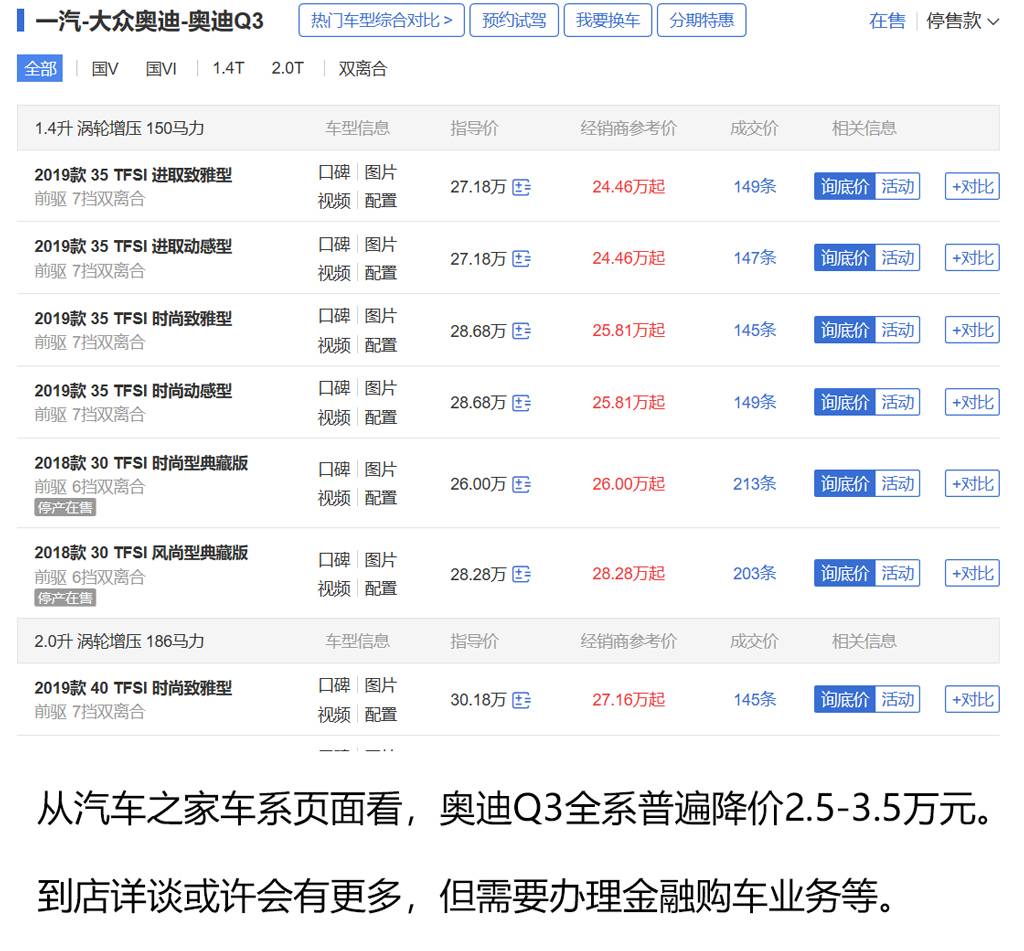 据亮仔查访4S店得知,目前奥迪Q3整个车系的优惠幅度颇高。由于竞品车型逐渐增多,而同价位下有更多其它品牌SUV可选,所以承担着销量重担的Q3降价也在情理之中。目前,奥迪Q3 1.4T车型北京地区的优惠大约在2.5-3.5万元之间,2.0T车型优惠同样不小。