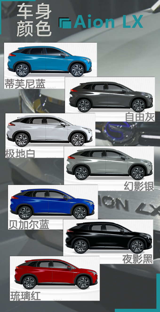 Aion LX共提供7种外观涂装、3种内饰颜色可供选择,为不同年龄层次的消费者带来多种选择。同时还可以选装豪华外观套装、运动外观套装(下文会提及),高度客制化在向许多豪华品牌看齐。