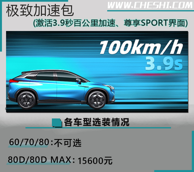首先是非常抢眼的极致加速包,选装价格为1.56万元,该选装包可以开放电机潜能,实现3.9S的零百加速成绩,同时拥有SPORT模式界面,不过该选装包仅提供给Aion LX 80D/80D MAX两款顶配车型选装,有些惋惜,不过理性下来分析该配置在日常驾驶并不十分实用,毕竟在绝大多数路况并不允许这类极限操作,因此极致加速包性价比一般,不推荐选装。