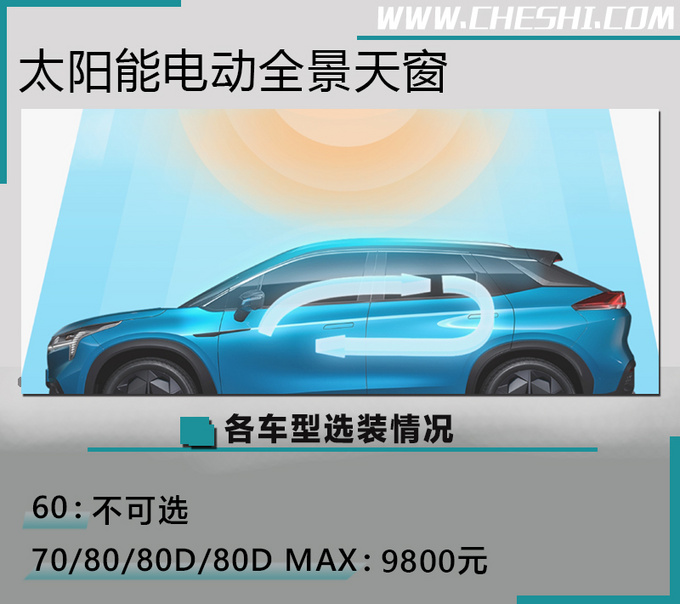同时除了Aion LX 60车型外,其余车型均可选装价格为9800元的太阳能智能生态仓及遮阳帘,能够通过光能驱动空调进行降温,该配置的使用性非常高,尤其是在炎热的夏季,提前将车内温度降至合适温度总比坐进“桑拿房”狼狈的将空调风量开至最大舒适的多,因此建议选装。