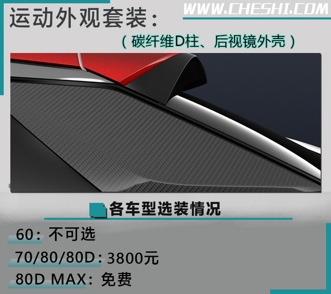 在外观上厂家还提供豪华外观套装(镀金D柱、充电指示条)/运动外观套装(碳纤维D柱、后视镜外壳)可供选择,顶配车型可以免费选装其中之一,其余车型(Aion LX 60不可选装)将花费2800/3800元进行选装,具体的选择还是需要根据个人喜好进行,因此在这里不做推荐。