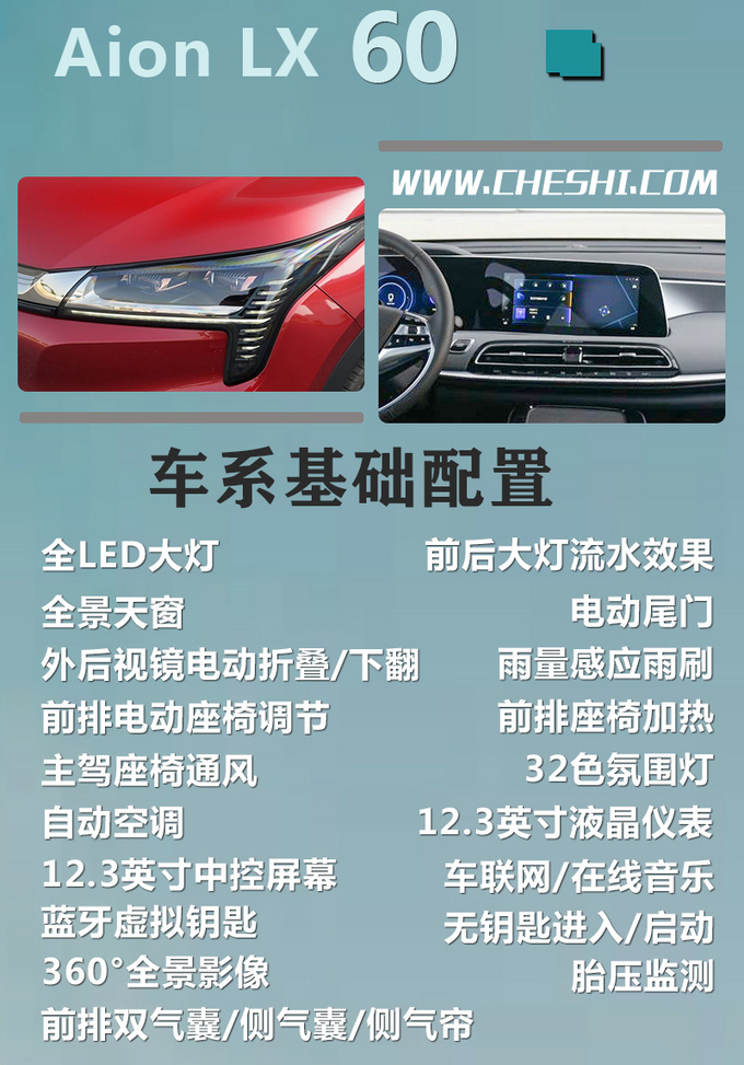 总结:Aion LX的5款车型在动力版本上能够满足不同人群对动力和续航的需求,在各个选装包中个人比较推荐太阳能智能生态仓、领尊智驾套装以及麂皮材质车顶,这三个选装包不论是档次感还是实用性方面都比较突出,唯一遗憾的是大部分选装配置在最低配的Aion LX 60车型上不能选装。