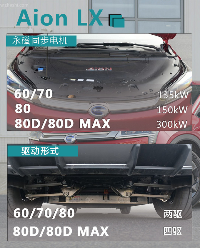 Aion LX共有五款车型,其中顶配和次顶配车型为四驱版本搭载最大功率300kW的永磁同步电机,其余车型为两驱版本,除了Aion LX 80搭载的电机最大功率为150kW外,其余车型搭载的电机功率为135kW,在续航方面,Aion LX 60车型的NEDC续航为503km,Aion LX 70车型的NEDC续航为520km,Aion LX 80车型的NEDC续航里程最高,达到了650km,紧随其后的是两款高配的Aion LX 80D、80D MAX车型,NEDC续航里程为600km。