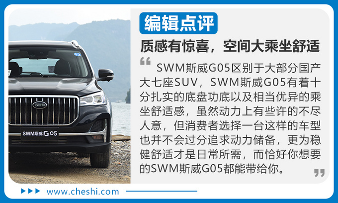 经过两天的试驾,SWM斯威G05还是给我了一种不一样的体验,区别于大部分国产大七座SUV,SWM斯威G05有着十分扎实的底盘功底以及相当优异的乘坐舒适感,虽然动力上有些许的不尽人意,但消费者选择一台这样的车型也并不会过分追求动力储备,更为稳健舒适才是日常所需,而恰好你想要的SWM斯威G05都能带给你。