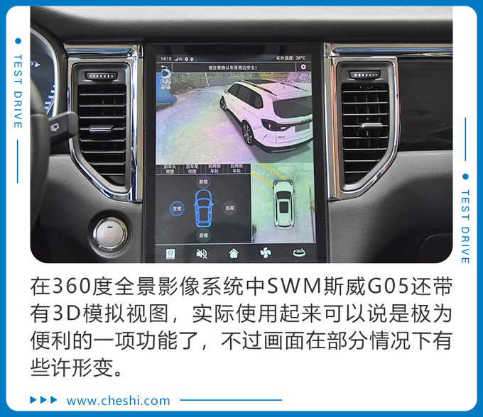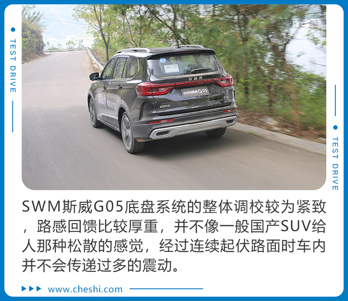 SWM斯威G05底盘系统的整体调校较为紧致,路感回馈比较厚重,整体感较好,并不像一般国产SUV给人那种松散的感觉,避震在下压和回弹时对路面上的细碎颠簸以及大的坑洼路面处理比较到位,后轮寻迹性极佳,经过连续起伏路面时车内并不会传递过多的震动。恰到好处的悬架调校加上较为柔软舒适的座椅,对于长途乘坐的舒适性上起到了很好的作用。