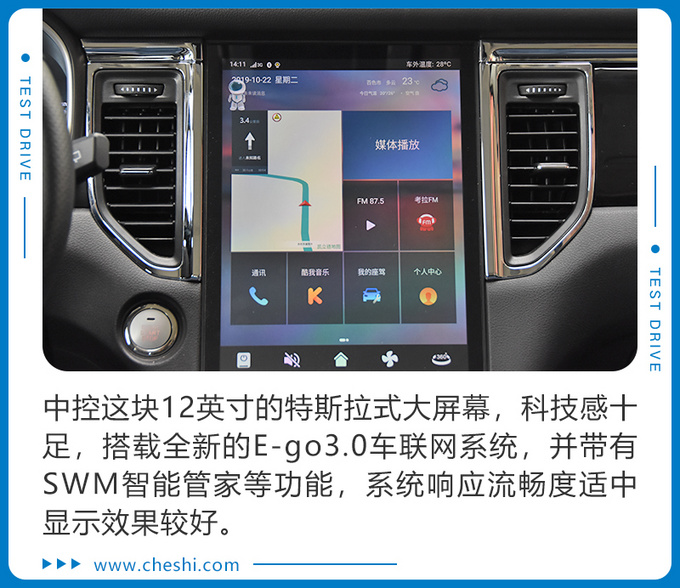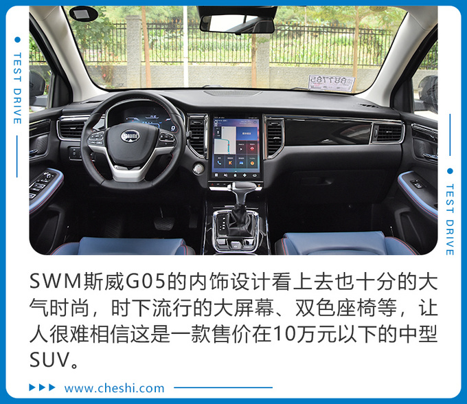SWM斯威G05的内饰设计看上去也十分的大气时尚,时下流行的大屏幕、双色座椅等,让人很难相信这是一款售价在10万元以下的中型SUV,内饰大量的应用了镀铬装饰条以及烤漆面板,让档次感大幅提升。