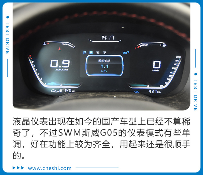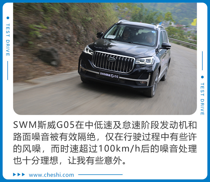 在NHV静谧工程方面我对于一台国产大七座SUV而言基本不抱什么希望,但“现实给了我一耳光”SWM斯威G05在中低速及怠速阶段发动机和路面噪音被有效隔绝,仅在行驶过程中有些许的风噪,而时速超过100km/h后的噪音处理也十分理想,让我有些意外。总体来说,新SWM斯威G05的NVH水平在同级车型中保持较高水平,让人刮目相看。