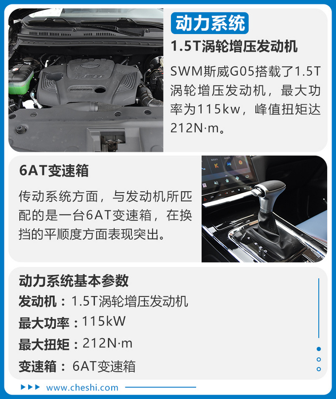本次试驾的SWM斯威G05搭载了1.5T涡轮增压发动机,最大功率为115kw,峰值扭矩达212N·m,与之匹配的是一台6AT变速箱,这两者在调校与匹配上更加贴合国内消费者的使用习惯与路况,在换挡的平顺度方面表现突出。