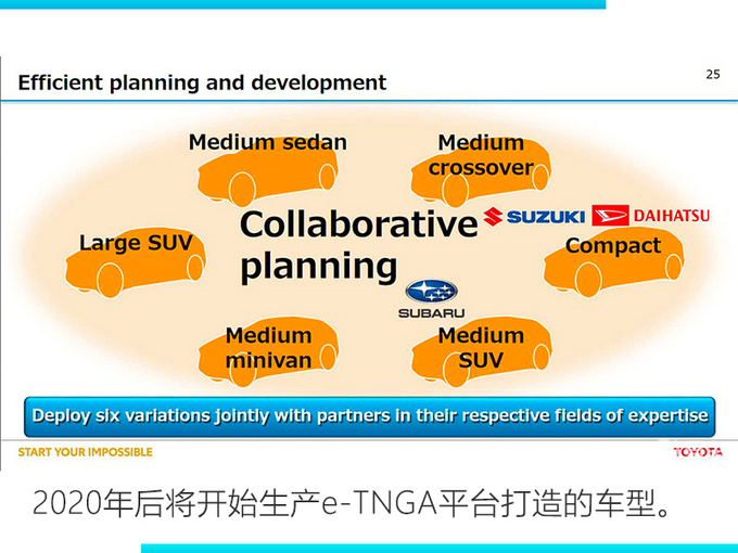 丰田在电动车领域的突然加速让很多人惊讶,此前丰田都在主攻混合动力和氢能源动力,并不是纯电动。从2020年起,丰田将推出全新纯电动平台和包括跨界车、SUV等6款面向全球市场的纯电动车型;大约至2025年,丰田将实现产品线的全面电动化,新计划首先将从中国市场的C-HR和奕泽IZOA的纯电动开始。