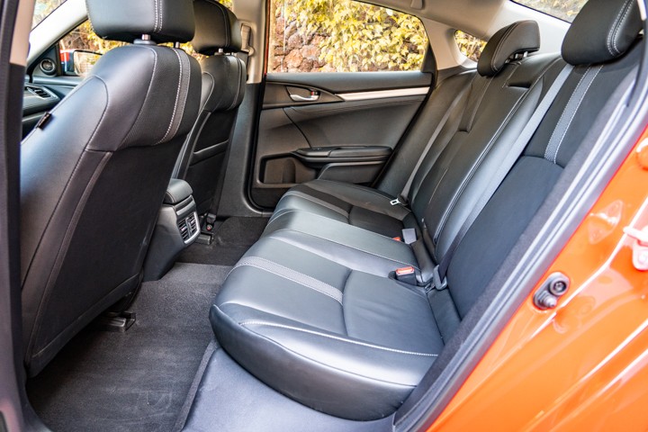 凭借着MM理念,本田旗下车型即使是飞度 (配置|询价)这个级别依然有着出色的后排空间表现,而思域的后排空间同样如此。看似不太宽裕的腿部空间其实是因为坐垫长度相当可观,实际乘坐的腿部余量还有不少,较为靠后的坐姿减少了因为溜背造型所带来的影响,同时前排座椅的修身设计让后排乘客的视野更为开阔。