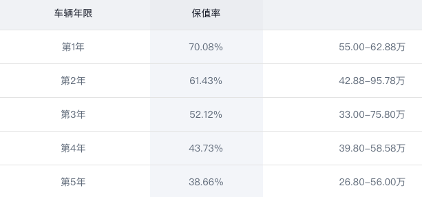 那为了解决用户“换车难”的问题,威马汽车也早在今年8月份就推出了官方二手车品牌, 将以直购、直翻、直销、直租模式贯穿二手车全生命周期;至于保值率,威马用户可享3年61.8%的保值率,通过补差价还可购买威马新款车型。那蔚来想要在保值率方面作出应对,就需要体现出比同级别的燃油车型更高的保值率,在中大型SUV中,宝马X5算是保值率比较高的一款车,从下图我们可以看到,宝马X5在第三年保值率上只有52.12%。