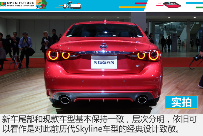 新款Skyline相比较现款车型而言在外观方面的改动还是比较大的,全新设计的前包围以及更加“日产”的大嘴式进气格栅都是在延续日产V-motion1.0的设计语言,换装了日产LOGO可以说是所有变化中最大的一个变化。车身侧面线条舒展比例协调,尾部除尾灯组内部造型进行了全新设计,换上了日产LOGO以外,并未做过多改动。