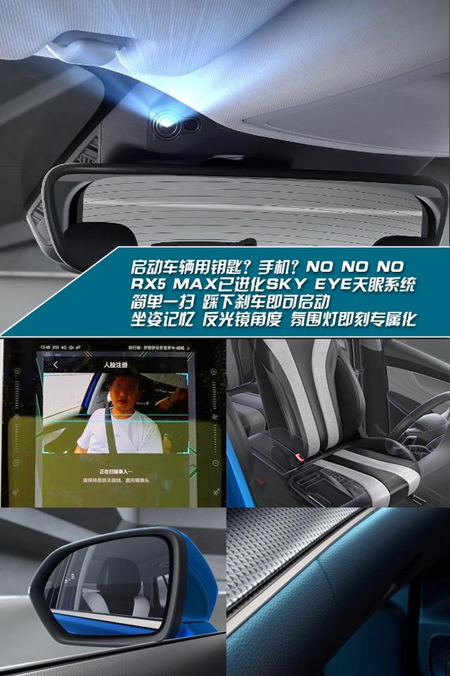 另外SKY EYE天眼系统、BYOD多用户随心控、互联网汽车智能系统3.0-Pro、车信、闪念助手等全新功能也是必须体验一番的。尤其是实现从语音识别到人脸识别的进化的SKY EYE天眼系统,它赋予了荣威RX5 MAX硬核“视觉”,能够主动识别面部信息,用户“刷脸”登录后,轻踩刹车即可启动车辆,告别手动“点火”时代,系统还会根据日期、天气等因素,为用户定制专属问候与提醒。