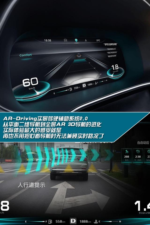 实际驾驶时,通过切换功能,仪表可以通过AR-Driving实景驾驶辅助系统2.0,实现从平面二维导航到全景AR 3D导航的进化。该系统能准确定位所在位置与具体车道,还原道路的真实场景,并将车辆状态、驾驶引导、环境感知等信息叠加在真实场景中,自带转弯、岔路、调头等路况实景指引,实现更精准的AR实景导航,还应用140度超大广角前置摄像头,能扩大视野消除A柱盲区,同时带来趣味POI实景标签,导航体验再升级。