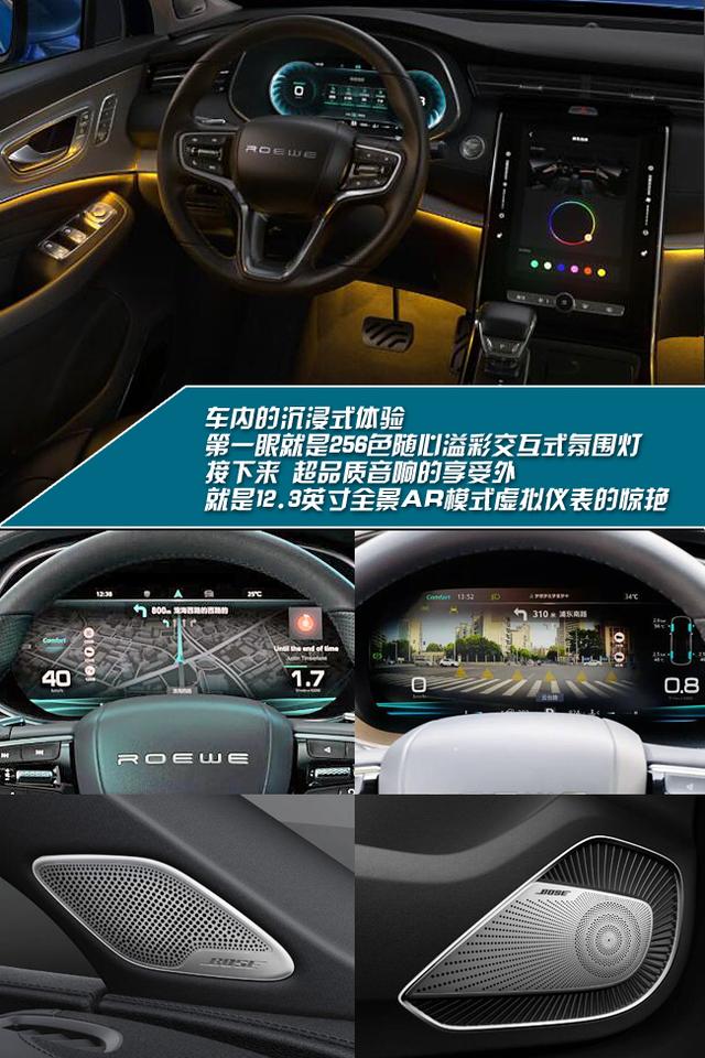 荣威RX5 MAX拥有多种高级材质奢华覆盖、超大对开式宽体扶手,品质感更高更气派,还搭载了BOSE沉浸式立体声音响系统、256色随心溢彩交互式氛围灯等高感知配置,通过视觉听觉触觉等五感联动打造车内的沉浸式体验。相比14.3英寸2.5D四曲面玻璃大屏,更惊艳的12.3英寸全景AR模式虚拟仪表几乎让人忘记了那些所谓的彩色液晶仪表。荣威RX5 MAX搭载12.3英寸全景AR模式虚拟仪表,首创四种全景显示模式,包括标准模式、全景智能驾驶模式、全景地图模式、全景AR模式,让体验者按需切换普通和运动风格,驾驶更随心便捷。