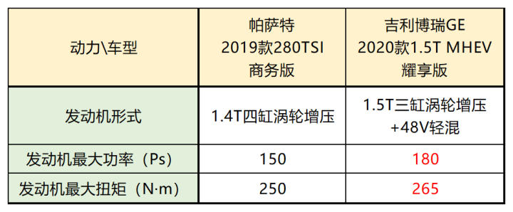 博瑞GE配备的是一台1.5T三缸涡轮增压发动机+48V轻混的动力系统。电动部分的数据吉利并没有公布,不过单看发动机的话它的最大功率及峰值扭矩数值都要好于帕萨特。传动方面它配备的也是7速双离合变速箱。